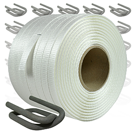 Umreifungsset mit extrem reißfestem, gewebten Textil-Umreifungsband und phosphatierten Drahtverschlussklemmen, für einfaches und sicheres Umreifen verschiedenster Güter.