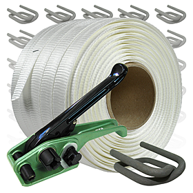 Umreifungsset mit Haspelspanner, gewebtem Textil-Umreifungsband in HD-Ausführung mit höherer Reißfestigkeit und phosphatierten Drahtverschlussklemmen, für einfaches und sicheres Umreifen verschiedenster Güter.